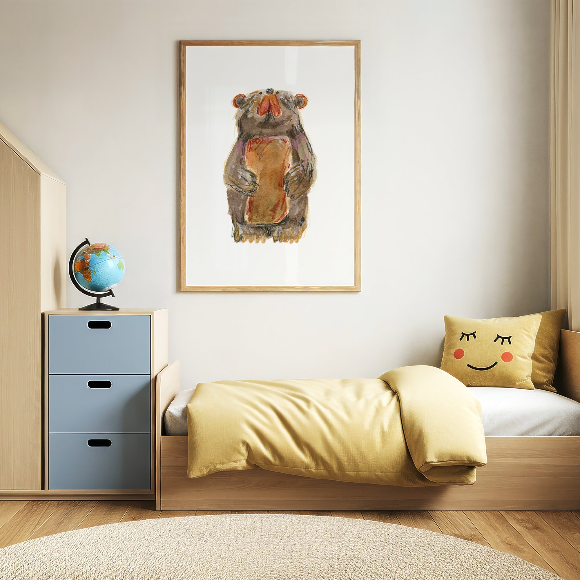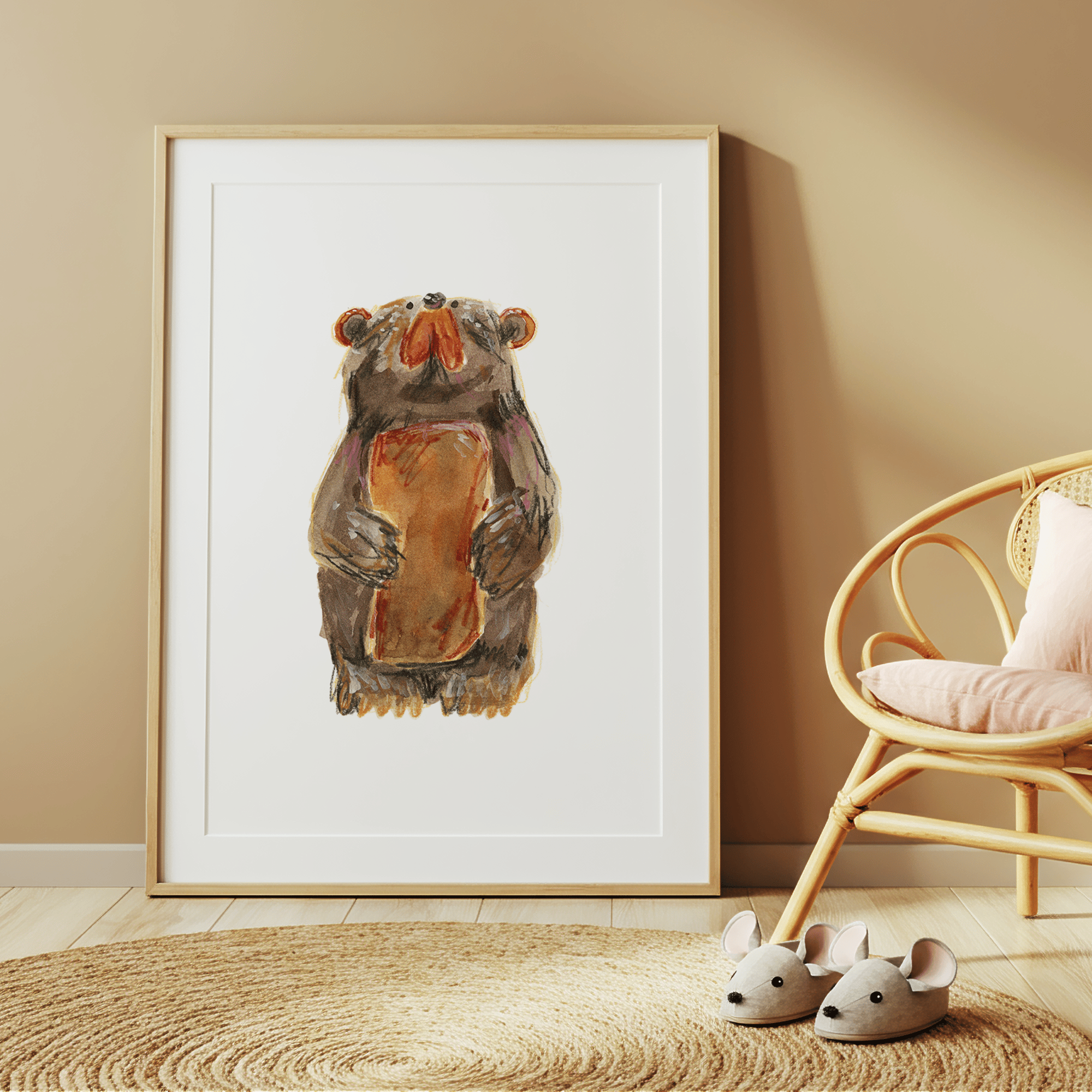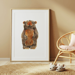Printed from an original illustration, this fine art print is produced on archival-quality paper to preserve the detail and softness of each mark. Arthur Bear lives in my local woods. My children love to say hello to him whenever we walk past. He first made an appearance on their bedroom walls and brings a smile every time I see him.