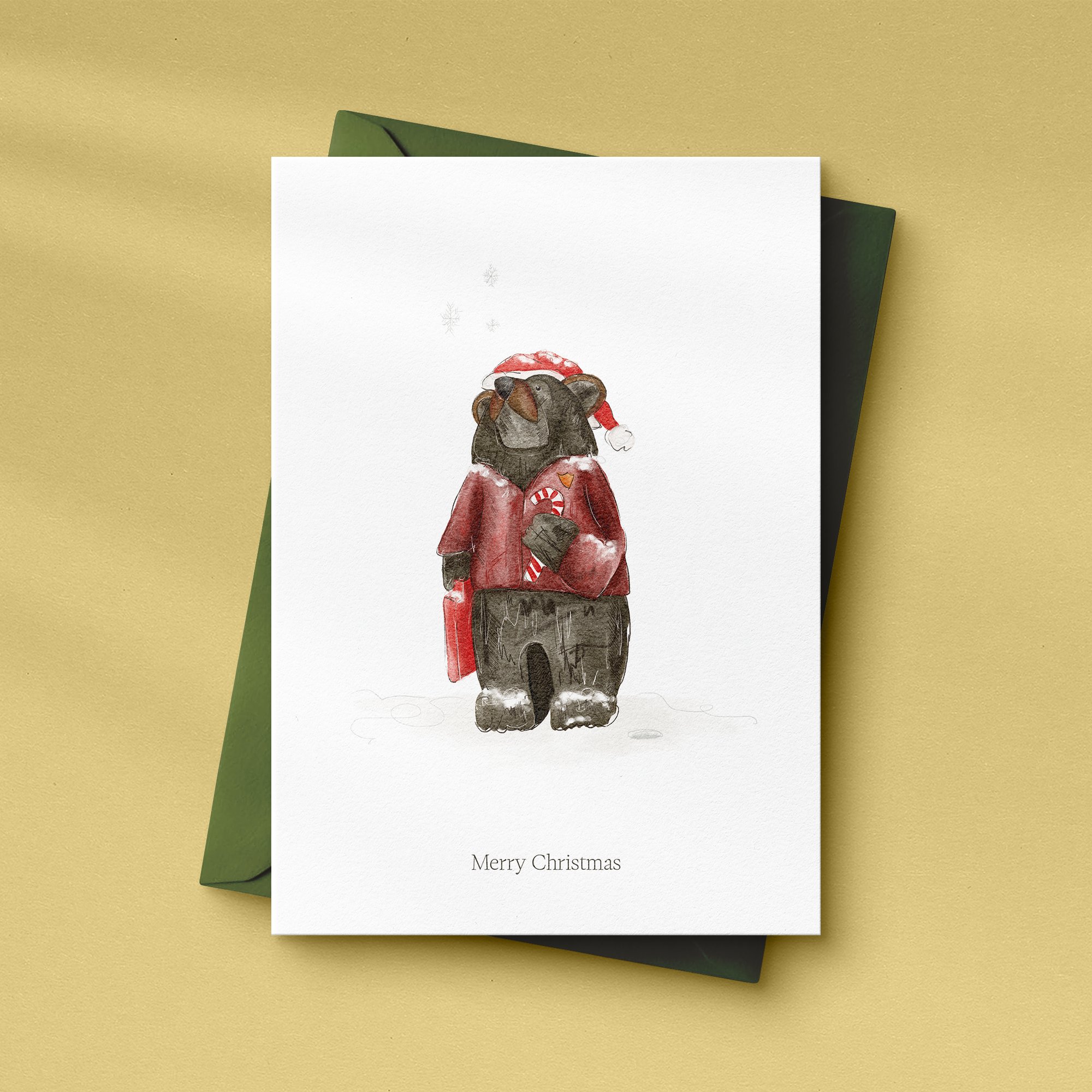 Set of five A5 Christmas cards featuring local celebrities from my area, these bears can be found hiding in the woods around where I live. They've each been given a Christmas twist.